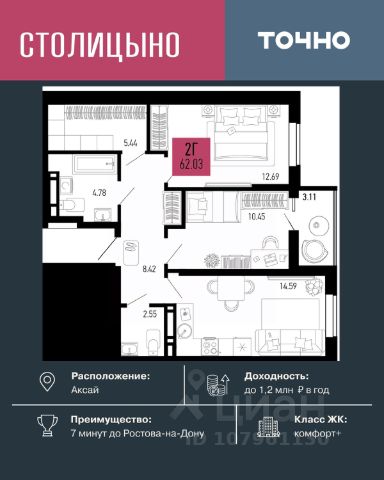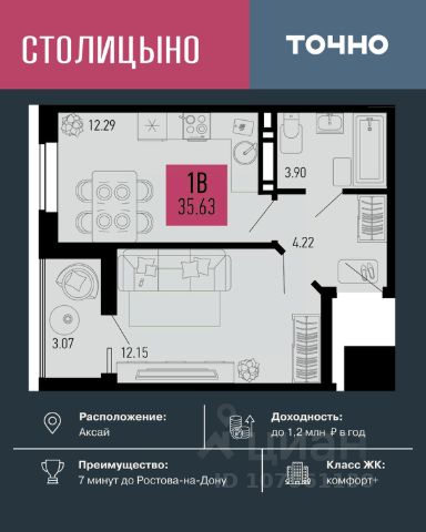 Продаётся 1-комнатная квартира в строящемся доме (Литер 1.1), срок сдачи: IV-кв. 2026, общей площадью 21.43 кв.м., на 7 этаже. Семейная ипотека 3,5% и ремонт под ключ с концепцией город в городе! Семейная ипотека 3,5% для семей с 2 детьми до 18 лет. Успейте купить квартиру с выгодой! Ключевые преимущества: • Ставка 3,5% — действует на весь срок кредита. • Ремонт под ключ — можно включить в ипотеку и не переплачивать. • Ипотека 0% — ежемесячный платеж всего от 25 000 руб. • Материнский капитал — первоночальный взнос по сертификату. • Скидка 10% для участников СВО + розыгрыш автомобиля! О жилом комплексе: Свой город внутри мегаполиса! Закрытая территория 42 га с парком, школой, садами, медцентром, фитнес-клубом с бассейном и подземным паркингом. Всё для комфортной жизни в экологичном районе Ростова-на-Дону. Купить 1-комнатную квартиру площадью примерно 20 м2 (кв.м.) в Аксае.