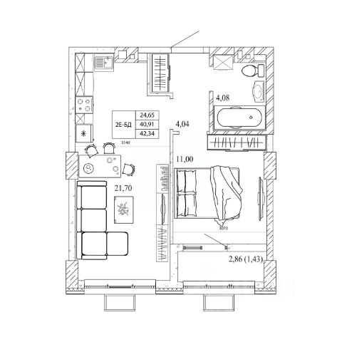 Общая площадь - 42 кв. м