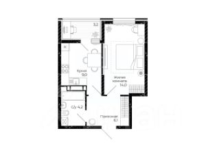 В квартире просторная кухня-гостиная с диваном, отдельная спальня, санузел и удобная гардеробная.