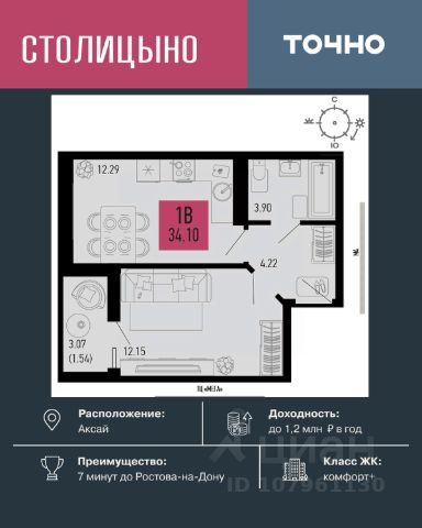 Продается уютная 1-комнтная квартира 40 м² в Аксае,в жилом комплексе "Твой дом"
