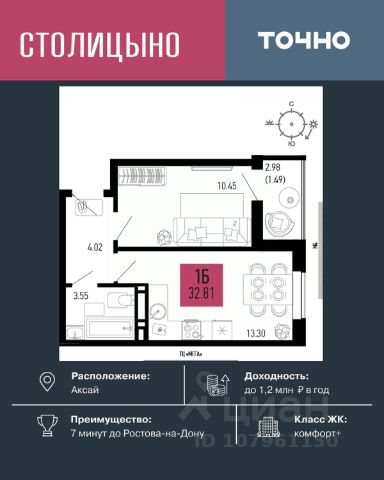 Продаётся 1-комнатная квартира 35,8 кв. м в центре Аксая, 5 км до Ростова. Дом сдан!