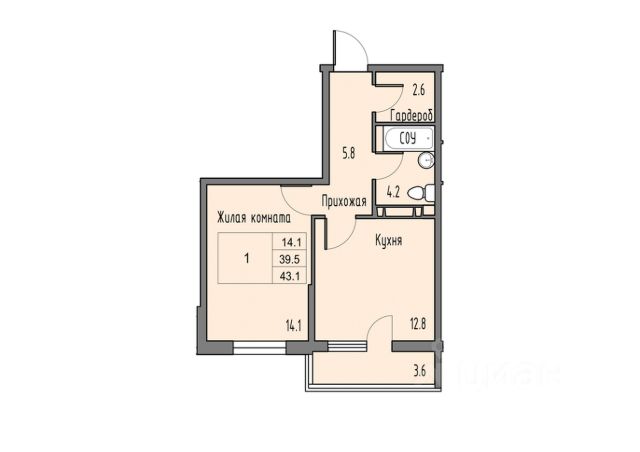 Хороший средний этаж, просторная кухня-гостинная 14м2 и уютная спальня 10,5м2