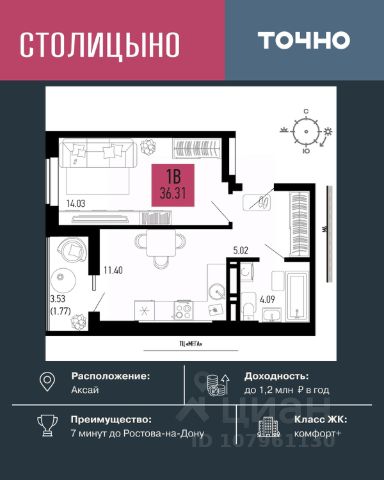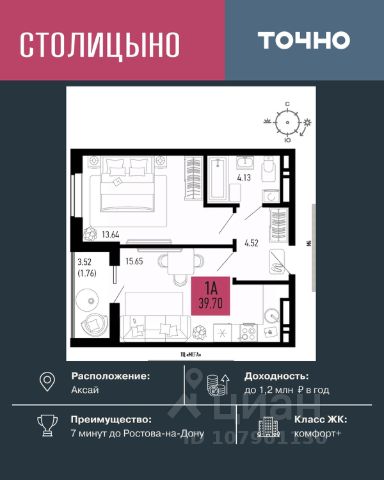Продаётся 1-комнатная квартира 34,4 кв. м в центре Аксая, 5 км до Ростова. Дом сдан!