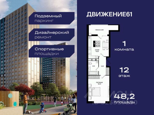 1-комнатная квартира в новом квартале "Движение61" Продается уютная 1-комнатная квартира в новом ЖК "Движение61" от надежного федерального застройщика "ЮгСтройИнвест" — лидером рынка Юга России. О квартире: Продуманная и функциональная планировка; Светлая комната с большим окном; Удобная кухня-гостиная — комфортное пространство для жизни; Отлично подходит для студентов, молодых специалистов, пары или для сдачи в аренду; Идеальна как первое собственное жилье или инвестиция; Теплый пол в кухне, прихожей и санузле. Квартира станет отличным выбором для тех, кто ценит комфорт, удобство, современную планировку. О квартале "Движение61": Новая современная локация на участке 21 гектар — территория, где созданы все условия для комфортной жизни: Школа на 900 мест; Детский сад на 400 мест; Широкие зелёные дворы; Спортивные и детские площадки, тренажеры, прогулочные зоны, зеленые рощи — комфорт прямо у подъезда; Подземный паркинг; Коммерция на первых этажах (кофейни, магазины, пункты выдачи). Жители получают безопасную среду, ухоженные дворы, продуманную инфраструктуру и комфорт в каждом элементе квартала. Локация — Шолохова / Новый Ростов: Территория комплексного развития "Новый Ростов" — будущий новый центр города: Центральный автовокзал: 3 мин; МЕГА, Лента, МЕТРО: 7 мин; Театральная площадь: 15 мин; Ж/д вокзал: 30 мин; Аэропорт: 40 мин. Выгодные условия от застройщика: Материнский капитал используйте как первый взнос; Ставка от 6% для IT-специалистов + скидка 4 000 ₽/м²; Военная ипотека без первоначального взноса; Мурабаха — выплата долями, без процентов; Квартира + паркинг; Ипотека от 3,5% — эксклюзивно для клиентов ЮгСтройИнвест"; Скидка 150 000 ₽ для молодожёнов; Теплый пол в подарок. ЮгСтройИнвест — надёжность 1. Интересуют планировки или хотите расчёт ипотечного платежа? Свяжитесь — подберем оптимальную квартиру и оформим для вас лучшие условия. Добавьте в избранное, чтобы не потерять выгодное предложение.