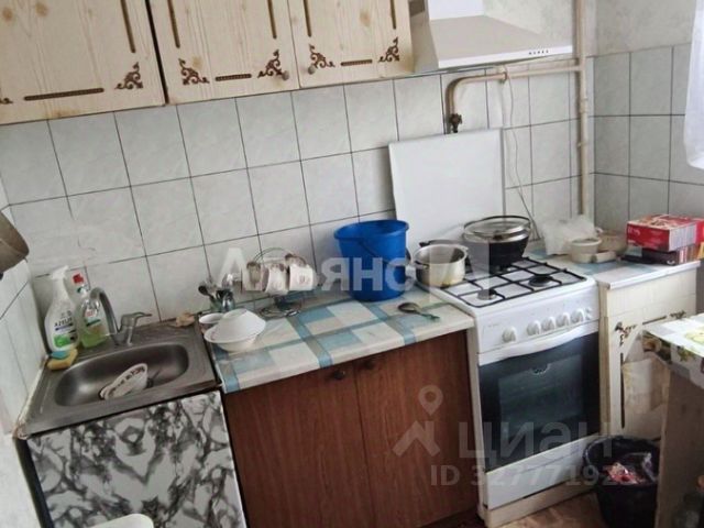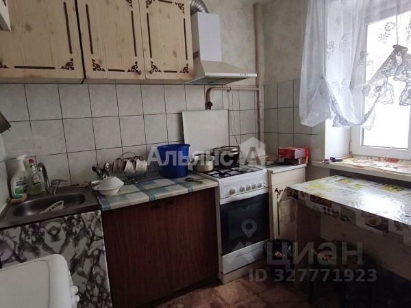 В квартире уютная кухня с газовой плитой и шкафом, где удобно готовить и хранить вещи.
