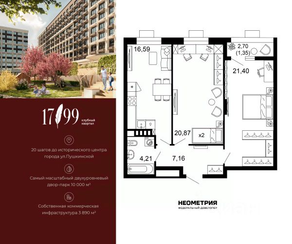 Продается квартира в клубном квартале "1799". Это истинный бизнес-класс в историческом центре Ростова. Особое сочетание уникальной локации и среды, где хочется создавать ту жизнь, которая подходит вам. Где каждое мгновение становится частью семейной коллекции лучших моментов. Квартал вдохновлен идеями великих и создан для великих. Образ хранителя ценностей — в каждой детали: имя и философия замедления, аристократичные фасады, лобби и холлы, семейные резиденции-истории и актуальное содержание. На приватной территории в 2,5 гектара четыре дома всего 10-этажей образуют масштабный двухуровневый двор-парк 10 000 м2 со smart-зонированием по возрастам и интересам. Среда квартала продумана для всей семьи: учебы и работы, спорта и отдыха, совместного досуга и теплых бесед. Гамак мечтателя, тайные места и маршруты, вертикальный сад пряных трав, амфитеатр и даже новогодняя ель. Резидентам доступны редкие для центра привилегии — природная тишина и свобода быть собой. Безукоризненный сервис и собственная коммерческая инфраструктура 3 890 м2, где все необходимое под рукой, позволяют жить в центре с бескомпромиссным комфортом. #26Ac6g