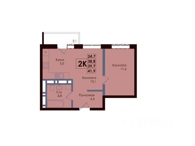 • Кухня 13 кв. м. правильной квадратной формы с выходом на лоджию