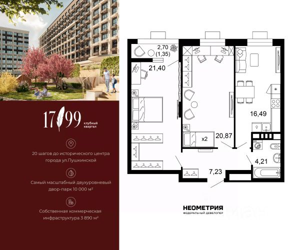 Продается квартира в клубном квартале "1799". Это истинный бизнес-класс в историческом центре Ростова. Особое сочетание уникальной локации и среды, где хочется создавать ту жизнь, которая подходит вам. Где каждое мгновение становится частью семейной коллекции лучших моментов. Квартал вдохновлен идеями великих и создан для великих. Образ хранителя ценностей — в каждой детали: имя и философия замедления, аристократичные фасады, лобби и холлы, семейные резиденции-истории и актуальное содержание. На приватной территории в 2,5 гектара четыре дома всего 10-этажей образуют масштабный двухуровневый двор-парк 10 000 м2 со smart-зонированием по возрастам и интересам. Среда квартала продумана для всей семьи: учебы и работы, спорта и отдыха, совместного досуга и теплых бесед. Гамак мечтателя, тайные места и маршруты, вертикальный сад пряных трав, амфитеатр и даже новогодняя ель. Резидентам доступны редкие для центра привилегии — природная тишина и свобода быть собой. Безукоризненный сервис и собственная коммерческая инфраструктура 3 890 м2, где все необходимое под рукой, позволяют жить в центре с бескомпромиссным комфортом.