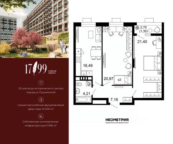 Продается квартира в клубном квартале "1799". Это истинный бизнес-класс в историческом центре Ростова. Особое сочетание уникальной локации и среды, где хочется создавать ту жизнь, которая подходит вам. Где каждое мгновение становится частью семейной коллекции лучших моментов. Квартал вдохновлен идеями великих и создан для великих. Образ хранителя ценностей — в каждой детали: имя и философия замедления, аристократичные фасады, лобби и холлы, семейные резиденции-истории и актуальное содержание. На приватной территории в 2,5 гектара четыре дома всего 10-этажей образуют масштабный двухуровневый двор-парк 10 000 м2 со smart-зонированием по возрастам и интересам. Среда квартала продумана для всей семьи: учебы и работы, спорта и отдыха, совместного досуга и теплых бесед. Гамак мечтателя, тайные места и маршруты, вертикальный сад пряных трав, амфитеатр и даже новогодняя ель. Резидентам доступны редкие для центра привилегии — природная тишина и свобода быть собой. Безукоризненный сервис и собственная коммерческая инфраструктура 3 890 м2, где все необходимое под рукой, позволяют жить в центре с бескомпромиссным комфортом. #ZmaCuE