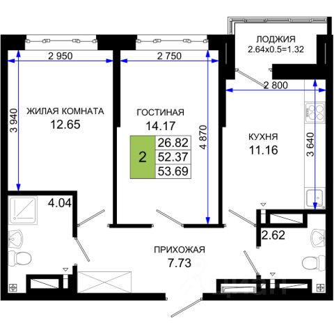 Двухкомнатная квартира площадью 53,7 кв.м расположена на 15 этаже современного жилого комплекса.