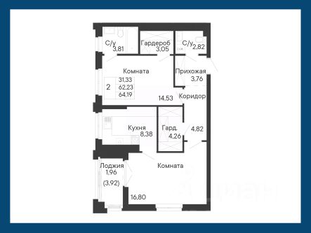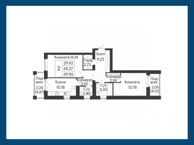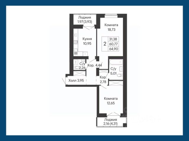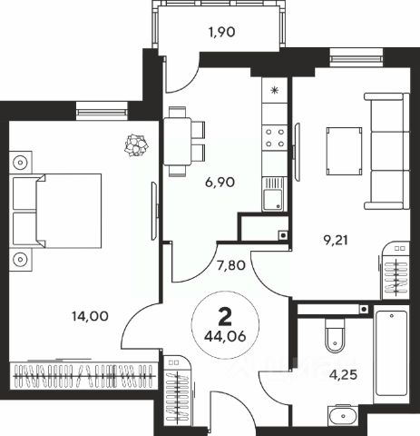 Большая двухкомнатная квартира уникального формата: с окнами в ванной комнате и мастер-спальней. Кухня-столовая и гостиная смежные, обе с выходами на отдельные лоджии.