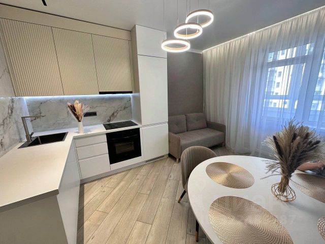 В квартире выполнен ремонт, установлена сантехника и свет. В прихожей, ванной комнате и санузле керамогранит, установлена хорошая входная дверь, на стенах оклеены обои с багетами. Заказана кухонная мебель и гардеробная.