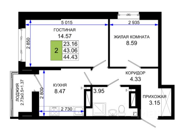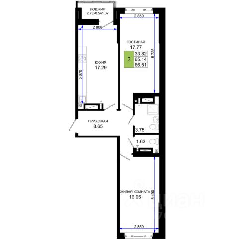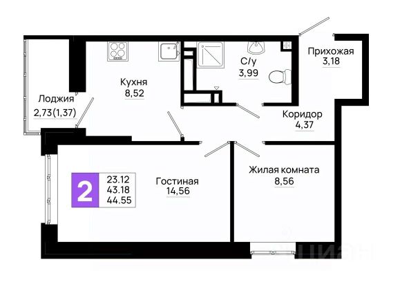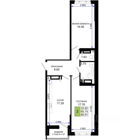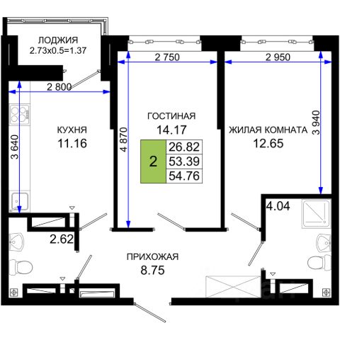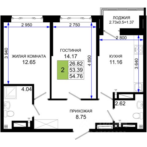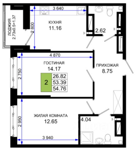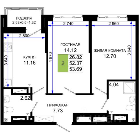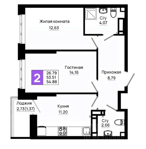 Двухкомнатная квартира площадью 53,7 кв.м расположена на 15 этаже современного жилого комплекса.