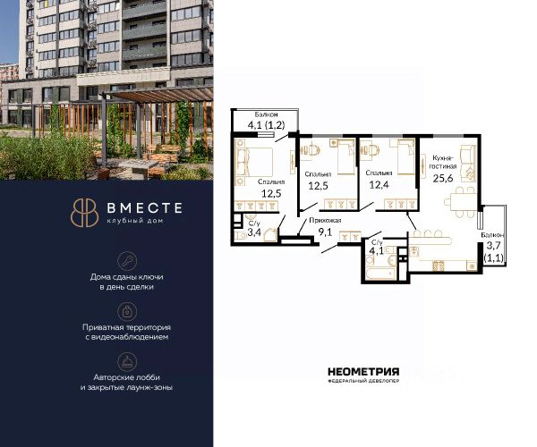 • Всего 4 квартиры на этаже