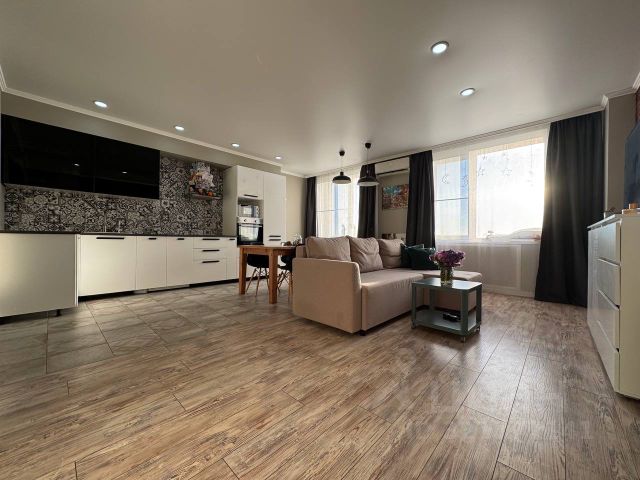 В квартире выполнен дизайнерский ремонт, который остаётся новому собственнику в подарок вместе с мебелью и бытовой техникой. Площадь 2-х раздельных жилых комнат составляет 30,5м.кв., кухни- гостиной- 28м.кв., в квартире есть 2 совмещённых санузла, гардеробная, лоджия застеклена, в переходной зоне коридора оборудовано рабочее место для учёбы или работы. Мастер-спальня для взрослых имеет панорамное остекление с 2-х сторон. Места общего пользования с полом из керамогранита имеют подогрев. Встроенная кухонная мебель из массива дуба оборудована бытовой техникой импортного производства: посудомоечная машина Воsсh, духовой шкаф и варочная панель Zаnussi, микроволновая печь Мidеа,холодильник двухкамерный Sаmsung, стиральная машина Sаmsung с окном загрузки.