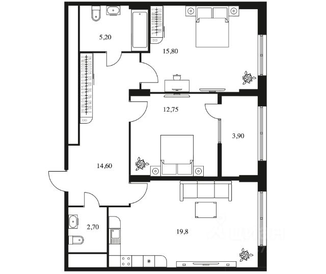 • 2 изолированные спальни: 15 и 16 кв. м с выходом на террасу из каждой