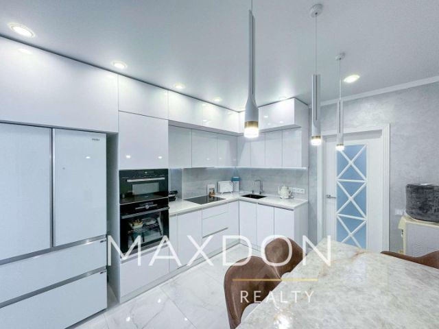 Дорогая кухня, выполненная на заказ, с каменной столешницей, фасады МДФ в эмали, вся фурнитура с доводчиками, фирмы Blum, мойка Omoikiri, двери Uberture, встроенная немецкая бытовая техника. Мебель Родион. Сантехника Roca, Grohe, Oras.
