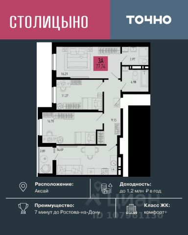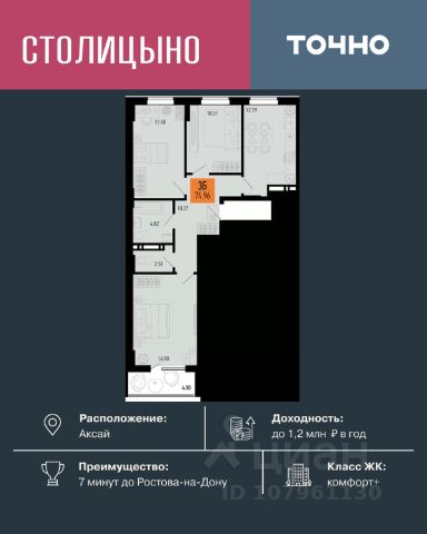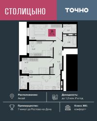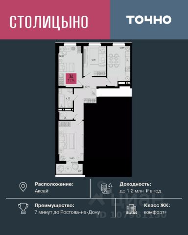 В продаже 3- комнатная квартира площадью 74,38 кв м на 7 этаже от застройщика. Ремонт в подарок! "Соседи. Лесной квартал" это жилой комплекс комфорт-класса, состоящий из 18 домов от 6 до 8 этажей. Расположен ЖК в уютном поселке Темерницком, всего в 10 минутах езды от Ростова-на-Дону. Соседи предлагают своим жителям спокойную жизнь вдали от городской суеты, при этом обеспечивая доступ ко всем необходимым удобствам и инфраструктуре для комфортного проживания. • Архитектура в скандинавском стиле с вентилируемым фасадом. • Стильные сквозные подъезды на уровне земли • Квартиры с террасой на первом этаже • Высота потолков от 2,7 м до 3,3 м • Колясочные в каждом подъезде • Двор без машин, благоустройство в экостиле с зонами отдыха • Детские площадки с интерактивными и классическими игровыми элементами из природных материалов для разных возрастов • Наземный паркинг на 1650 машиномест по периметру ЖК • Спортивные площадки и тренажеры во дворах, велодорожки и тактильные тропы для прогулок • Детский сад у дома, новая школа и фельдшерский пункт в 7 минутах • Супермаркеты, пункты выдачи заказов, остановки общественного транспорта в шаговой доступности Приобрести квартиру можно одним из способов: - рассрочка до конца строительства - оплата наличными - материнский капитал - ипотека - дистанционная покупка