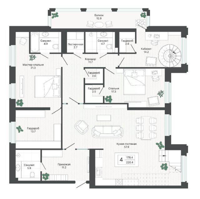 Приобрести уникальную квартиру, которая будет соответствовать именно вашим пожеланиям по площади, теперь возможно: в доме-резиденции "Собрание" для этого доступна опция персонального объединения квартир. Так можно создать квартиру с просторной кухней-гостиной, домашним кинотеатром или несколькими мастер-спальнями для каждого члена семьи. Такое планировочное решение четырехкомнатной квартиры имеет следующие преимущества: - Три мастер-спальни - Четыре лоджии