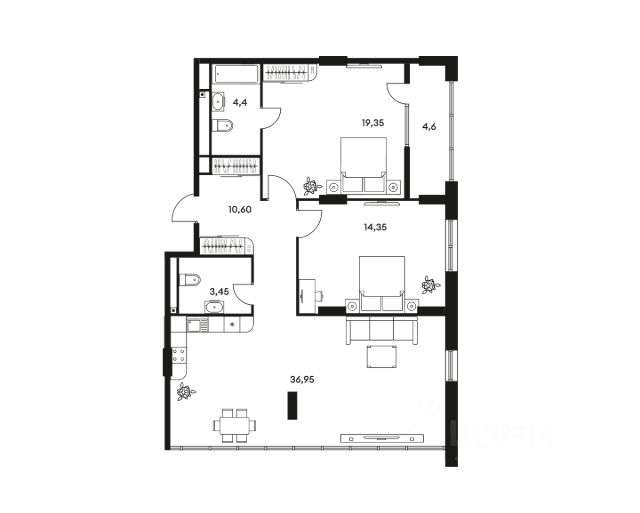 • 2 изолированные спальни: 15 и 16 кв. м с выходом на террасу из каждой