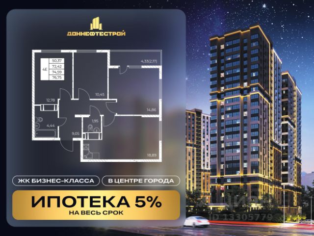 Общая площадь квартиры составляет 77 кв.м, 15 кв.м кухня-гостинная, 3 раздельные комнаты с просторной планировкой, 2 санузла, с возможностью создания отдельной зоны (мастер-спальни).