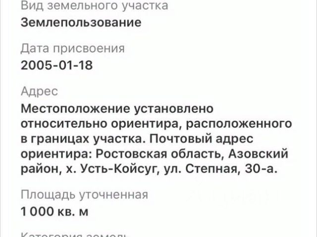 Продаю два соседних участка по 6 соток, не объединяла. СТ Квант, Азовский район, 13-ая улица, участки 547 и 548 Осмотр самостоятельный, потому и продаю, не могу ездить. Участки ровные, старые плодовые деревья, не ухожены. Свет по меже - столб в 2 м, вода техническая была (уточните у председателя, как сейчас подключится). Забора нет. Документы в наличии, взносы уплачены. Рядом живут сторожа. От Ростова-на-Дону 30 км, от Азова 15 км. от г.Батайска 19 км Рядом: с.Кулешовка (8 км), п.Овощной (10 км), с.Высочено (7 км), п. Тимирязевский (5 км - 10 мин.) Ст.жд. Высочено Цена указана за два участка (по кадастровой стоимости). 150 000 р С вопросами о садовом товариществе (свет, вода, дорога, взносы) можете обратиться к председателю: просп. Стачки, 219/2, Ростов-на-Дону, СТ Квант Вт. 09:00 11:00 Ч. 15:00 17:00