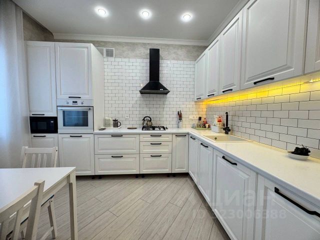 Отдельная кухня с полным комплектом бытовой техники: холодильник, духовка, плита, микроволновка, посудомоечная и стиральная машины.