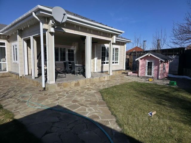 Здравствуйте, меня зовут Станислав, я собственник. В связи с переездом я и моя семья приняла решение о продажу нашего дома. Не побоюсь этого слова это уникальное предложение, начну с общего описания, на участке в 8 соток разместились техническое помещение (котельная с подвалом), навес на две машины, подогреваемый бассейн 7х3м, дом из клееного бруса 100+17м2, мангальгая зона и детский домик из клееного бруса. Есть подробные видео и фото хода строительства в основном сохранённые в запрещенной соц. сети. Расположение в начале посёлка буквально одна улица от асфальта, вокруг все участки застроены, хорошие соседи. До центра посёлка (магазин пятёрочка, пвз озон, ВБ, сдек, аптека; кофейня, клуб и ФАП) 300метров. пешком 10мин. До ТЦ Мега 10мин. • Участок 8соток формой параллелограмма, с небольшим уклоном в сторону дороги, за счёт подпорных стен (каскадов) разбит по высоте на 4 зоны . Со всех сторон огражден забором, с фасадной стороны и одной стороны кирпичные колонны с проф. листом, с двух других проф. лист с ж/б раствором. Основание двора ж.б. покрыт плиткой, в зоне дома природным камнем, около 2х соток засажено газом, много плодовых и декоративных деревьев. Септик с переливом из 4х колец, дополнительно 4 кольца для отвода дождевой воды. • Техническое помещение (котельная) 17м2 выполнена в 1,5 кирпича на белом шве, в отдельной комнате распологается унитаз и раковина. В котельной располагаются газовый котельная висман 30. бойлер косвенного нагрева, система хранения. Под всем строением ж/б подвал 18м2. где расположен бак с запасом воды, насос, стабилизаторы напряжения, оборудование для бассейна и системы хранения. • Навес 6х8 из проф. трубы кровля из проф. листа с двухсторонним покрытием. • Бассейн 3х7м подогреваемый за счёт газового котла, пластиковая чаша утеплённая, основание ж.б. плита 300мм, стенки из ж.б. 250мм • Дом из клееного бруса 100м2, стены сечением 202мм наружные стены, 152 перегородки. 2 спальни по 15м2, 1 спальня (кабинет) 13м2; кухня гостинная 36м2; с/у 6м2 с ванной и душевой; небольшое техническое помещение 2м2 под стиралку и сушильная машину. Высота потолка 3м. Чердак с покрытием из доски. В гостиной, с/у и коридоре тёплый пол. Терраса с выходом из кухни 17м2, периметр закрывается сдвижными сетками от насекомых для комфортного время провождения. Фундамент ленточный с обратной засыпкой сверху плита 150 мм с двойным армированием • Мангальная зона: основание жб плита 200мм в зоне комплекса 400мм, кровля с открытой стропильной системой и покрытием из гибкий черепицы. Комплекс включает мангал, печ под казан, столешницу с мойкой. • Детский домик из клееного бруса 80мм с песочницей, чистовыми полами и отделкой. Стоит на временном фундамента, можно убрать и организовать другую зону.