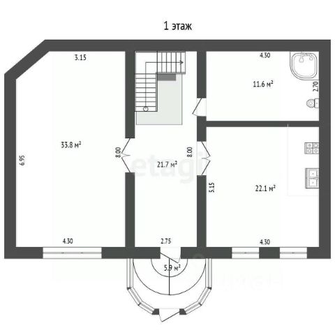 Первый этаж (кв.м.): прихожая 6.2; спальня - гостиная 17,3; спальня 11,5; санузел 5,3; кухня 14,2;
