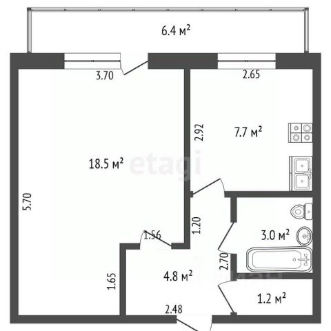 Общая площадь 45,2 м², жилая — 16,1 м², кухня — 7,7 м²