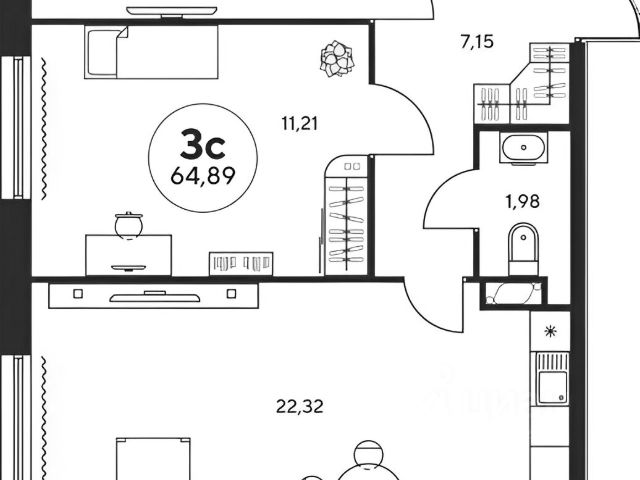 - кухня 5м2, жилая зона 10м2
