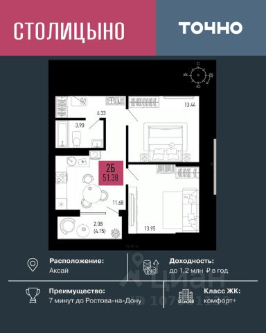 Продается квартира площадью 49 кв. м, расположена на пятом этаже в центральной части г. Аксай, на проспекте Ленина.