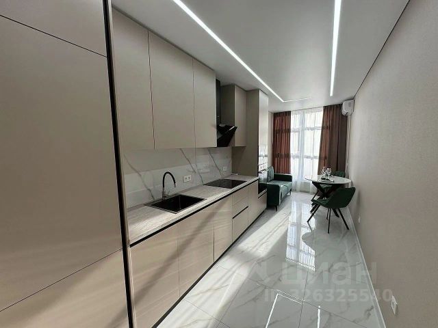 потолки на теневом профиле, смонтированы вдоль мебели , что выглядит максимально современно и аккуратно