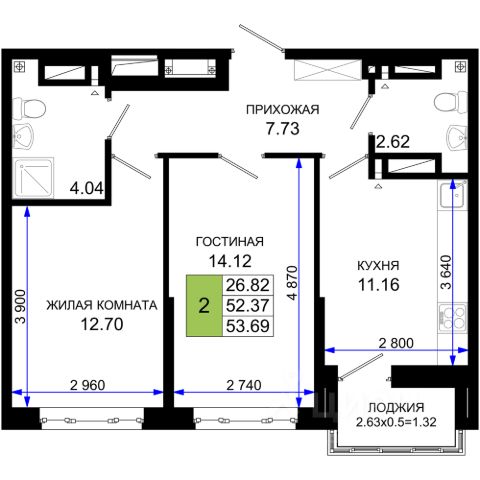 Кухня-столовая 15.5, и две изолированные комнаты 13,5 и 18 кв.м.