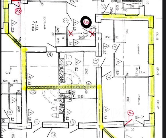 Два санузла: В одном — унитаз, раковина; во втором — ванна, унитаз, раковина.