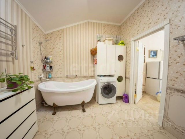 Санузел совмещен, установлено современное оборудование, джакузи, стиральная машинка, стены в премиальной плитке.