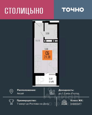 Продается студия, площадью 23.4 м2 в монолитно-кирпичной новостройке. Возможен вариант покупки с использованием ипотечных средств, есть рассрочка, возможна покупка с использованием материнского капитала, есть военная ипотека. Жилая площадь 20.1 м2, квартира без отделки, комнаты смежные. Квартира располагается на 17 этаже 18-этажного дома в ЖК Придонье. Застройщик - ГК ССК, сдача дома - II квартал 2028 года, высота потолков 2.72 м. Дом оборудован пассажирским лифтом. Парковка автомобилей - наземная. Обеспечение безопасности: видеонаблюдение. Инфраструктура: школа, детский сад, поликлиника, детские площадки, спортивные площадки, места для отдыха. Придонье - микрорайон, куда хочется возвращаться и откуда не хочется уезжать. Здесь созданы все условия для теплой, безопасной и семейной жизни - вместе с теми, кто дорог. Микрорайон создан для тех, кто ставит семью на первое место - здесь современные школы и детские сады расположены в шаговой доступности, а традиции добрососедства и атмосфера маленького города делают каждый день теплее и спокойнее. Приобретая просторную трёхкомнатную квартиру в микрорайоне Придонье , вы получаете в подарок качественный ремонт Стандарт. Мы проведем полный цикл отделочных работ - от подготовки поверхностей до чистовой отделки, - чтобы ваше новоселье стало по-настоящему радостным и беззаботным событием. Больше не нужно тратить время на поиск мастеров, выбирать материалы или контролировать работы - просто переезжайте и начинайте жить с комфортом. Микрорайон Придонье создан для тех, кто ценит семейные ценности и стремится дать близким самое лучшее. Здесь, в атмосфере уютного маленького города, вас ждут современные школы и детские сады в шаговой доступности, а добрые традиции добрососедства наполняют каждый день теплом и спокойствием. Это место, где дети растут в безопасной среде, а у взрослых есть всё для комфортной и размеренной жизни среди зелени и продуманной инфраструктуры. Позвоните и узнайте условия покупки прямо сейчас! Купить квартиру-студию до 4 млн. рублей в Аксае.