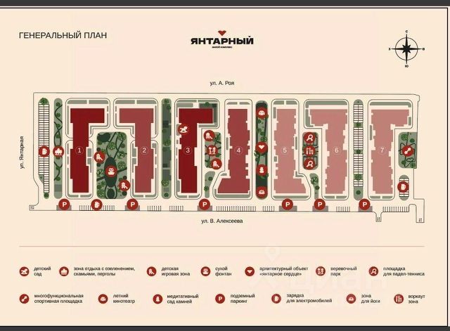 Пишите Территория зонирована под интересы всех жильцов комплекса между паркингом и 1 литером - аллея с кленами и лавочками между 1 и 2 литерами - две детские площадки, разработанные под разные возрастные категории (здесь 6-12 лет) фонтан с прогулочными зонами и местами отдыха между 2 и 3 литерами - территория детского сада между 3 и 4 литерами - веревочный парк с детскими площадками (для детей 1-5 лет) между 4 и 5 литерами - одна из ключевых локаций - янтарное сердце фото зона, летний амфитеатр, медитативный сад камней, место для йоги между 5 и 6 литерами - две зоны для падел-тенниса , воркаут с современными тренажерами около 7 литера - многофункциональная спортивная площадка (для футбола, баскетбола) на территории будет высажено более 300 разновидностей деревьев, кустарников, цветов , что будет создавать уникальный ландшафт комплекса отмечу , что для этих целей высаживать будут уже взрослые деревья и кустарники , не придется ожидать , когда территория примет обещанный облик Wi-Fi на всей территории , скамьи с розетками