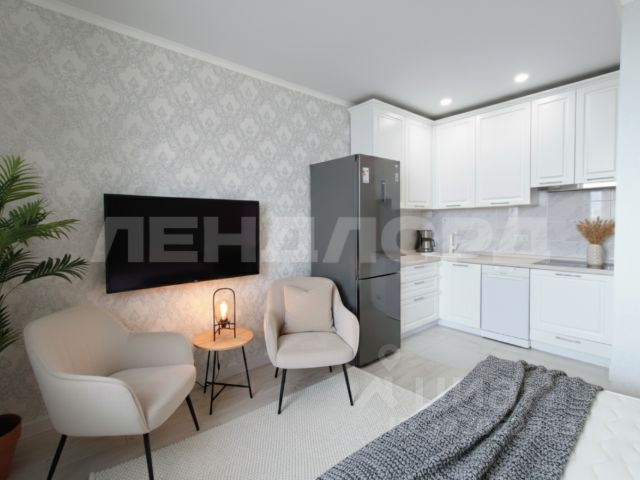 Удобная планировка включает в себя большой зал с выделенной зоной кухни. Санузел и ванная комната совмещенная. Кухня оснащена гарнитуром, который включает в себя встроенные шкафы, ящики и рабочую поверхность со всей необходимой кухонной техникой, что позволяет организовать пространство максимально эффективно и удобно. Все помещения обставлены с заботой, интересное сочетание цветовой палитры и использование качественных строительных материалов создают атмосферу уюта и комфорта. Освещение студии разнозоновое, что позволяет точечно включать определенную зону.
