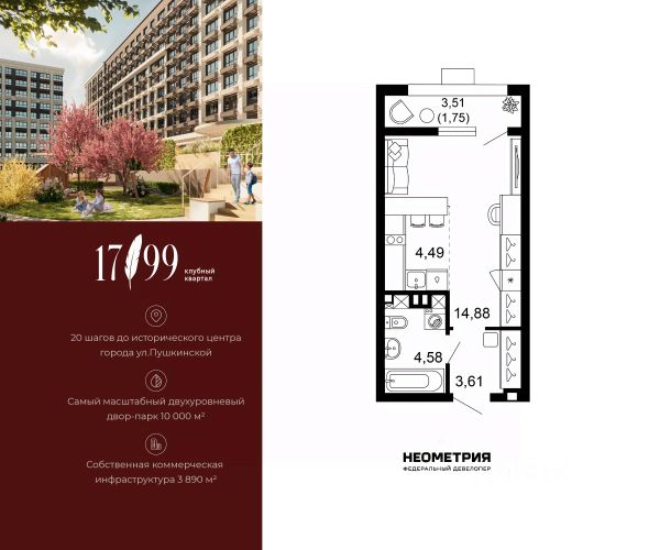 Продается квартира в клубном квартале "1799". Это истинный бизнес-класс в историческом центре Ростова. Особое сочетание уникальной локации и среды, где хочется создавать ту жизнь, которая подходит вам. Где каждое мгновение становится частью семейной коллекции лучших моментов. Квартал вдохновлен идеями великих и создан для великих. Образ хранителя ценностей — в каждой детали: имя и философия замедления, аристократичные фасады, лобби и холлы, семейные резиденции-истории и актуальное содержание. На приватной территории в 2,5 гектара четыре дома всего 10-этажей образуют масштабный двухуровневый двор-парк 10 000 м2 со smart-зонированием по возрастам и интересам. Среда квартала продумана для всей семьи: учебы и работы, спорта и отдыха, совместного досуга и теплых бесед. Гамак мечтателя, тайные места и маршруты, вертикальный сад пряных трав, амфитеатр и даже новогодняя ель. Резидентам доступны редкие для центра привилегии — природная тишина и свобода быть собой. Безукоризненный сервис и собственная коммерческая инфраструктура 3 890 м2, где все необходимое под рукой, позволяют жить в центре с бескомпромиссным комфортом. #zMB587 Квартира-студия с балконом в Ростовской области.