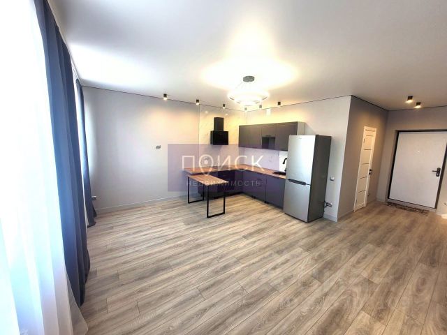 В квартире выполнен качественный ремонт в современном стиле, установлена кухня с техникой, есть холодильник и стиральная машина.