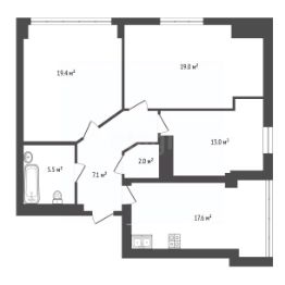 Планировка включает в себя: уютную спальню 19 м2 и детскую 13 м2, просторную гостиную 19,5 м2, большую кухню 17,6 м2, а также совмещенный санузел 5,6 м2, гардеробную 2 м2 и коридор 7,1 м2.