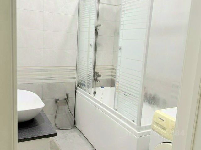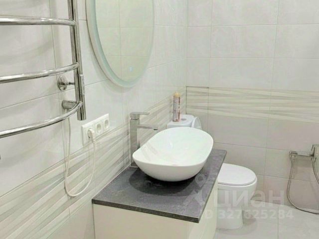 Санузел 4,5 м.: тёплые полы, акриловая ванна, тумба с раковиной, зеркало с подсветкой, тропический душ, гигиенический душ, водонагреватель, электрический полотенцесушитель.