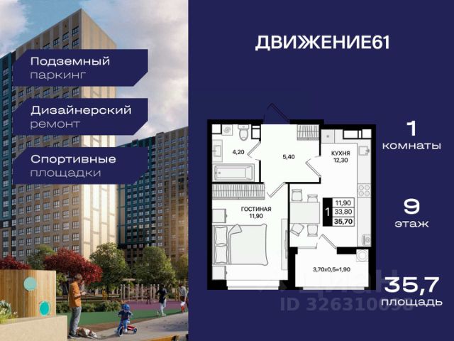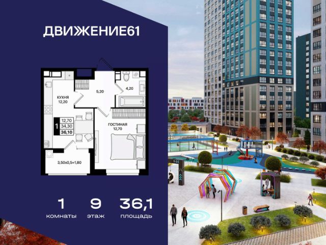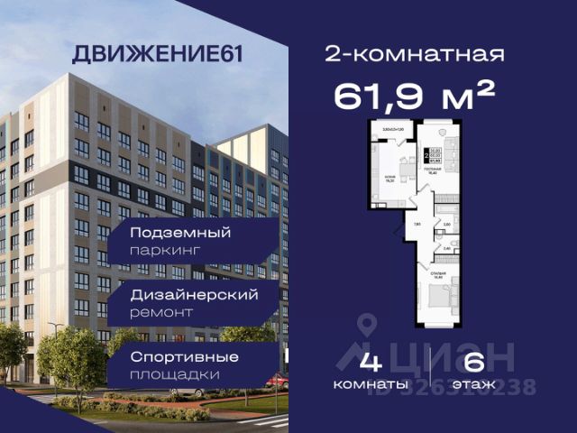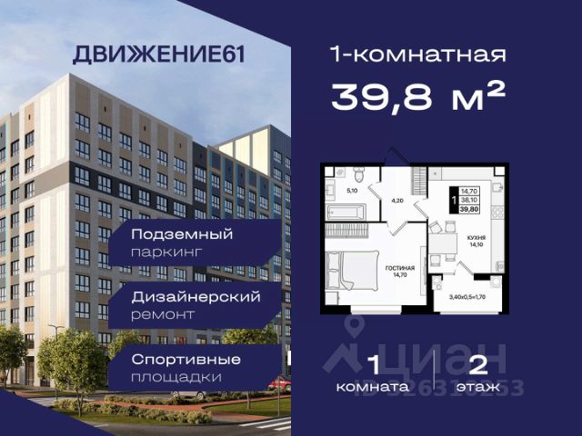 1-комнатная квартира в квартале "Движение61" — комфортный формат для жизни и инвестиций от надежного застройщика ЮгСтройИнвест. Если вы ищете современную, удобную и доступную квартиру в динамично развивающемся районе — 1-комнатная квартира в "Движение61" идеально подходит как для жизни, так и для сдачи в аренду. Комплекс строится крупным застройщиком ЮгСтройИнвест, мы известны высоким качеством строительства, продуманными кварталами и планировками, а также сдачей домов точно в срок. Площадь и планирова: В продаже 1-комнатная квартира — комфортный формат с продуманным пространством. Преимущества: — Отдельная спальня; — Правильные прямые формы комнат; — Большие окна и светлые помещения; — Место под гардероб/хранение. Квартал "Движение61" — современная среда для жизни: Зелёные аллеи и уютные дворы; Территория без машин — безопасно для прогулок; Детские и спортивные зоны; Удобное расположение и транспортная доступность; Рядом магазины, школы, сервисы; Паркинг, кладовые, инфраструктура нового уровня; Современный стиль застройки. Выгодные предложения на 1-комнатные квартиры: ПВ от 140 000 ₽ по ставке 6%; Ипотека от 0 ₽ первого взноса; Ипотека 0,11% на первый год; Семейная ипотека — от 3,5% / 3,9%; Теплый пол — в подарок; Скидка до 6000 ₽/м² при оформлении в день обращения; IT-скидка + IT-ипотека под 6%; Скидка для молодоженов; Скидка иногородним — 5000 ₽/м²; Для соцработников — выгода до 6000 ₽/м²; Для участников СВО — 8000 ₽/м²; Стоп-цена — фиксация стоимости на 60 дней; Паркинг от 46 800 ₽ при покупке квартиры. Можно подобрать вариант под любой бюджет и запрос. Надежный застройщик: ЮгСтройИнвест — один из крупнейших и наиболее стабильных девелоперов юга России. Постоянно внедряем новые стандарты благоустройства, сдаем дома вовремя и предоставляем выгодные финансовые решения. Условия покупки: — Ипотека любыми программами; — Рассрочка; — Материнский капитал; — Дистанционное оформление; — Безопасная сделка по 214-ФЗ. Кому подходит 1-комнатная квартира: Тем, кто хочет купить собственное жилье по выгодной цене; Молодым людям и семейным парам; Тем, кто инвестирует — ликвидная планировка; Для сдачи в аренду — высокий спрос; Для тех, кто выбирает современный квартал с инфраструктурой. Напишите — подберем подходящие планировки, вышлем цены и расскажем, какие акции действуют именно на 1-комнатные квартиры. 1-комнатная квартира в "Движение61" — удобный старт, разумная цена и благоприятный район для жизни!