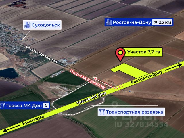 Подъезд к участкам с асфальтированной дороги (ул. Центральная), соединяющей федеральную трассу М-4 Дон и п. Суходольск. Развязка позволяет выполнить выезд на трассу как в сторону г....