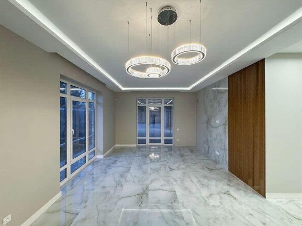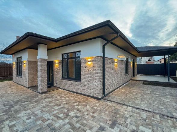 Продается одноэтажный дом 130 кв.м с абсолютно новым ремонтом в закрытом коттеджном посёлке Локация: кп Жемчужный, кп Изумрудный, кп Олимпийский • Благоустроенная территория участка. Под тротуарной плиткой залита бетонная площадка • забор по всему периметру, кладка и откатные авто-ворота • уютная терраса • высококачественный ремонт • кухонный гарнитур и встроенная мебель • в шаговой доступность школа в посёлке Янтарный.