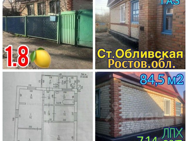 ст-ца Обливская, ул.Грызлова, жилой дом кирпичный и кирпичная отдельно стоящая газифицированная летняя кухня ( с ремонтом), общая площадь жилого дома 75,6 кв.м., общая площадь летней кухни 24 кв.м. на земельном участке - 12 соток, участок в собственности, межевание сделано. Все коммуникации: газ, электричество, водопровод хоз.питьевой, выгребная яма. В доме отремонтированы 2 комнаты, кухня и сан.узел. Еще 2 комнаты в стадии ремонта. Крыша шифер. Планировка: входная группа, коридор, кухня столовая, сан.узел, 4 комнаты. Вспомогательные строения: гараж пристроен к дому, погреб отдельный на участке, кухня кирпичная газифицирована, сарай деревянный, душ, туалет уличный. Земельный участок разделен на две зоны: под сад и огород и отдельно для животных. Вся инфраструктура рядом: школа, магазин, остановка общественного транспорта. Добавьте дом в "Избранное", чтобы не потерять объявление! ПРИЕМ ЗВОНКОВ: с 9-00 до 20-00.