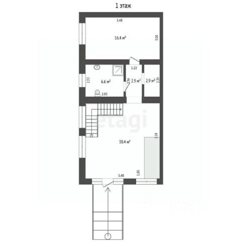 Небольшая, но вместительная прихожая, где можно разместить гардеробную для верхней одежды, переходит в просторный холл с круговой лестницей, под которой размещена вместительная кладовая, два окна наполняют пространство светом. Также на первом этаже есть гостиная столовая 28 кв.м., где можно разместить справа большую кухню, а слева гостевую зону. А так же гостевой санузел.