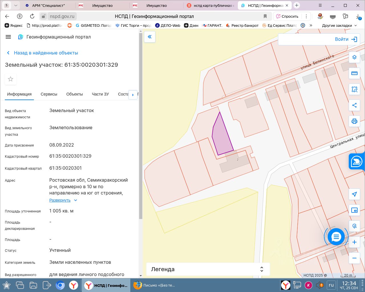 Данные получены с сайта ГИС Торги. Земельный участок с кадастровым номером 61:35:0020301:329 площадь 1005 по адресу Ростовская обл, Семикаракорский р-н, примерно в 10 м по направлению на юг от строения, расположенного по адресу: п. Горный, ул. Центральная, 2