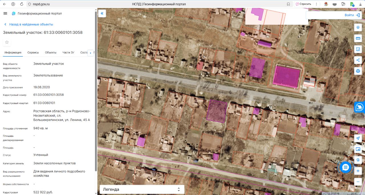 Земельный участок из земель населенных пунктов Большекрепинского сельского поселения, площадью 940+/-11 кв.м., кадастровый номер 61:33:0060101:3058, местоположение: Ростовская область, р-н Родионово-Несветайский, сл. Большекрепинская, ул. Ленина, 45 А, вид разрешенного использования: для ведения личного подсобного хозяйства